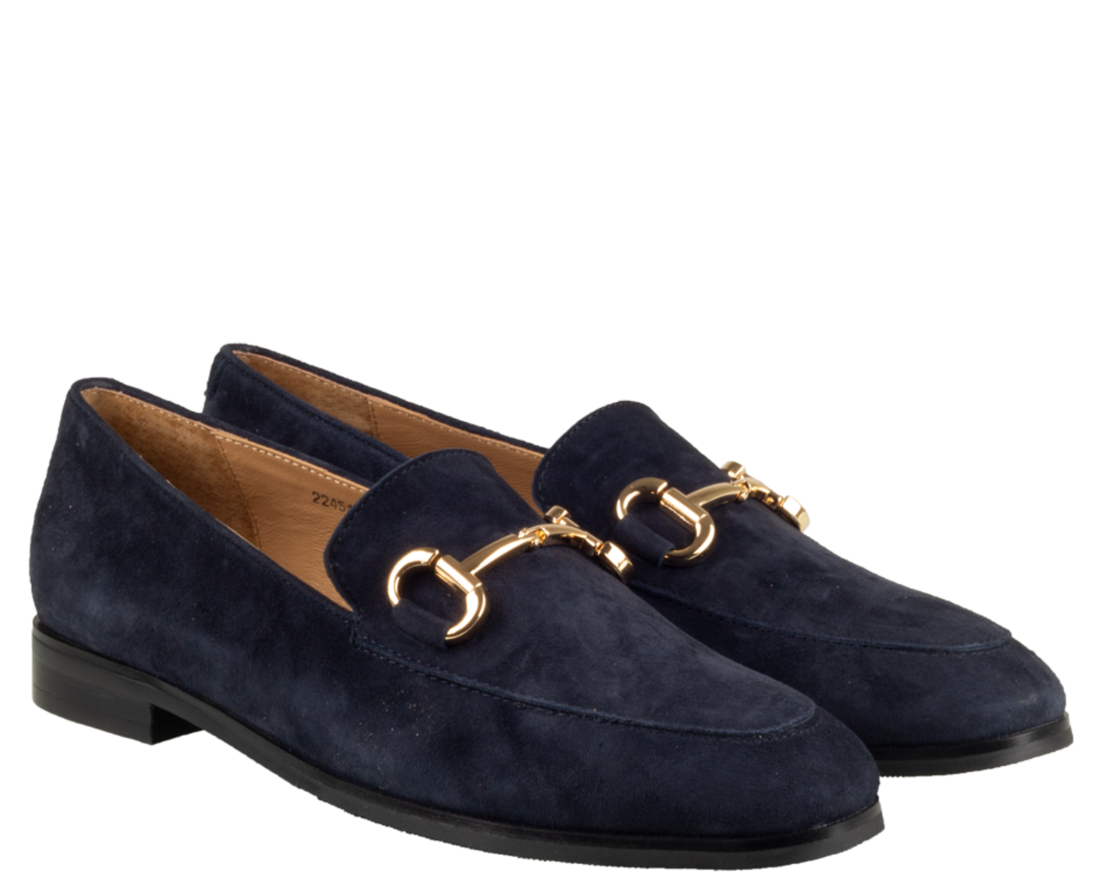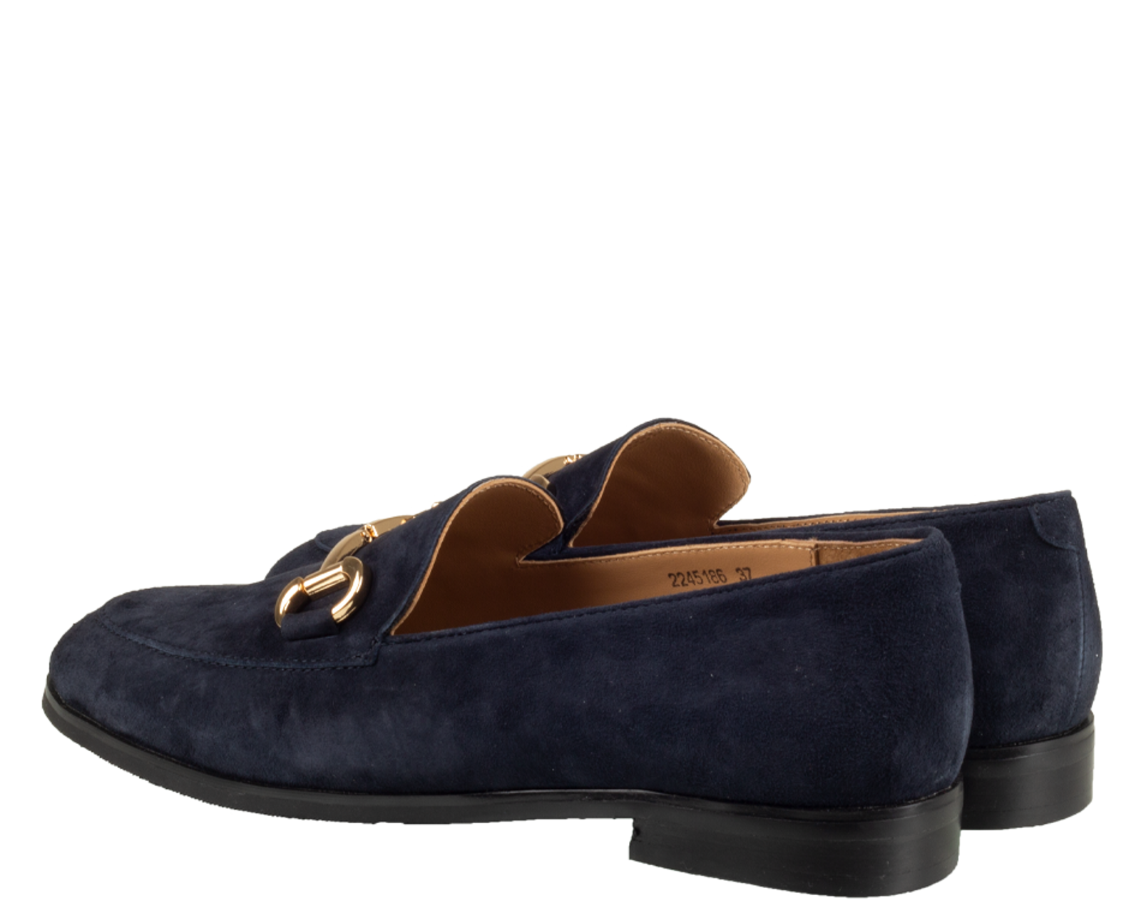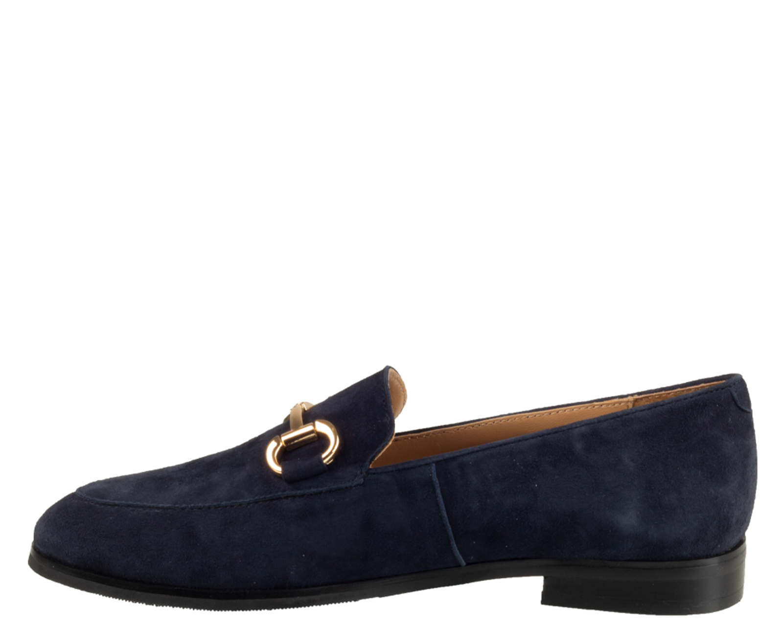 Di Lauro loafers. Deze Di Lauro Laure Loafers zijn vervaardigd uit suede en hebben een leren binnenvoering. De stijlvolle, blauwe instappers voor dames zijn afgewerkt met een goudkleurig bitje op de wreef en een klein hakje van ongeveer 1 centimeter.
